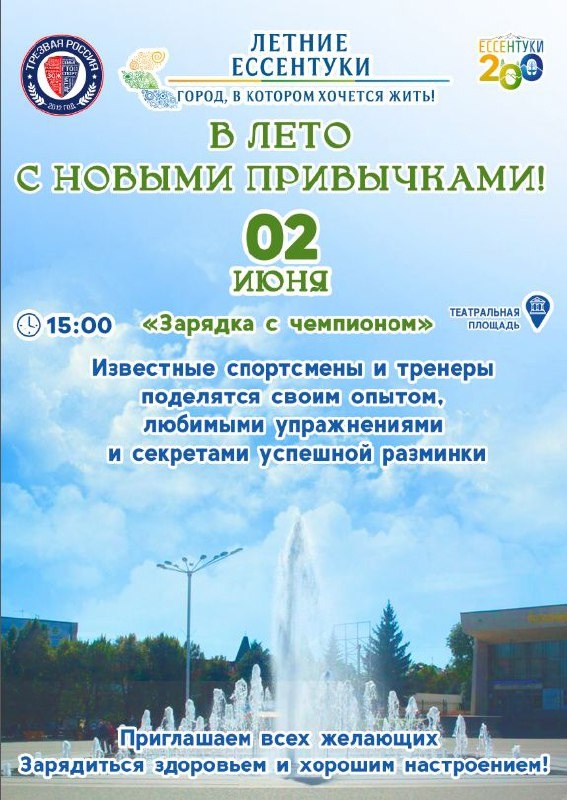 Летние Ессентуки: Зарядка с чемпионом 2 июня, 15:00, Театральная площадь Приглашаем всех желающих присоединиться к уникальной зарядке с известными спортсменами и тренерами! В этот день вы сможете попробовать свои силы в любимых упражнениях и узнать секреты успешной разминки. Это отличный способ зарядиться здоровьем и хорошим настроением на весь день! Не упустите возможность провести время с пользой и удовольствием в одном из самых красивых городов России — Эссентуки. Мы ждем вас на Театральной площади, где под открытым небом и в приятной атмосфере вы сможете насладиться активным отдыхом и общением с единомышленниками. Приходите, заряжайтесь энергией и вдохновением вместе с нами!