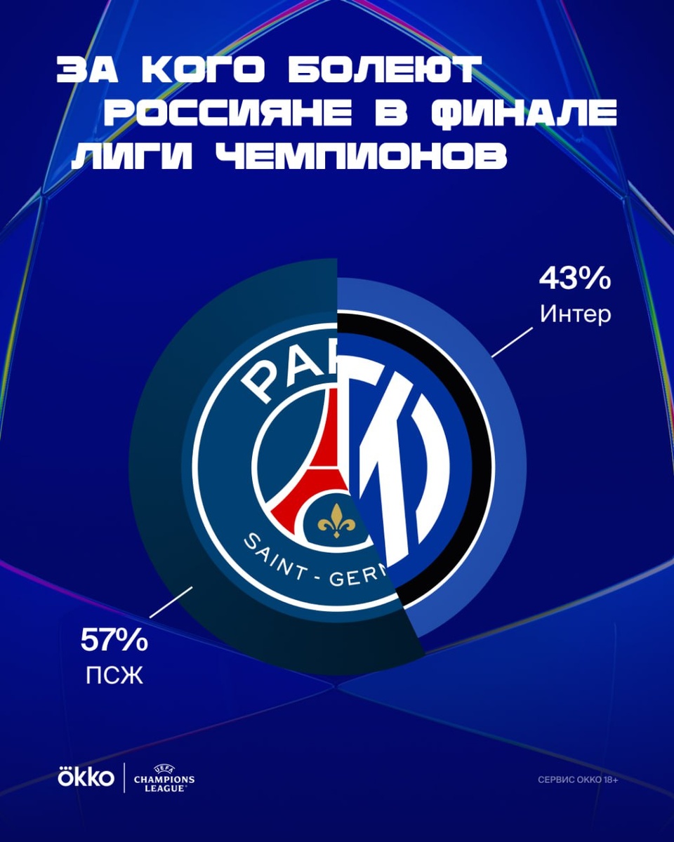 За кого болеют россияне в финале Лиги чемпионов? Провели масштабное исследование вместе с «Чемпионатом». ⚽ 57% россиян ставят на «ПСЖ». ⚽ 43% — на «Интер». Интерес к турниру стабильно высок — 73% следят за ЛЧ регулярно. Смотри финал сегодня эксклюзивно в Okko.