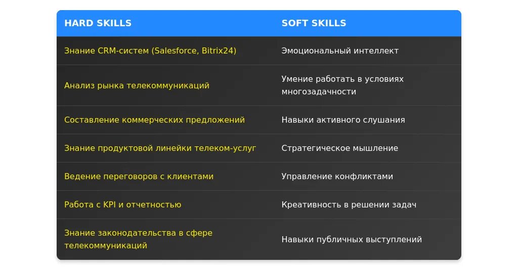 Анализ: Навыки переговоров и достижения планов — обязательные. Знание CRM — желательное, но не критичное.
