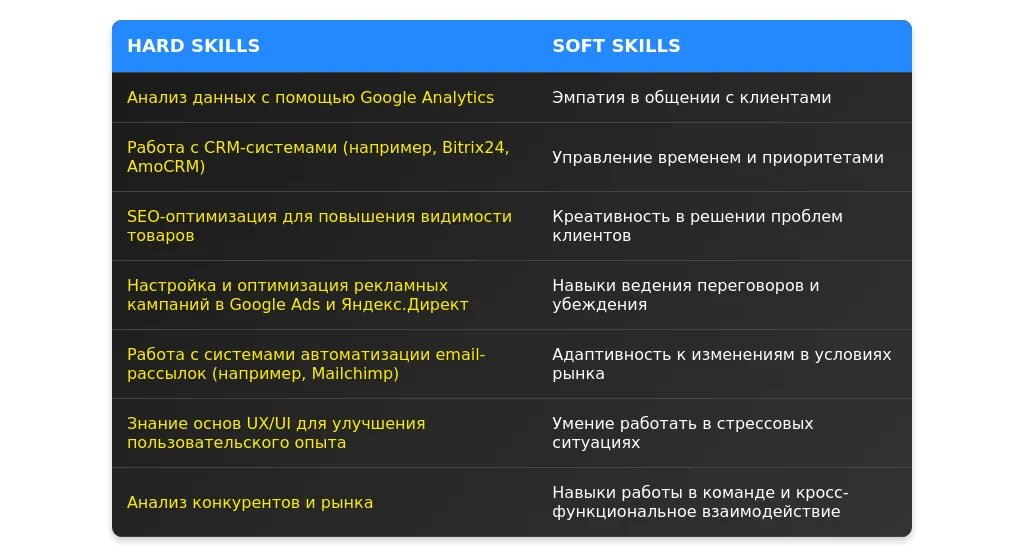 - Профессиональные навыки (например, работа с CRM, аналитика продаж).