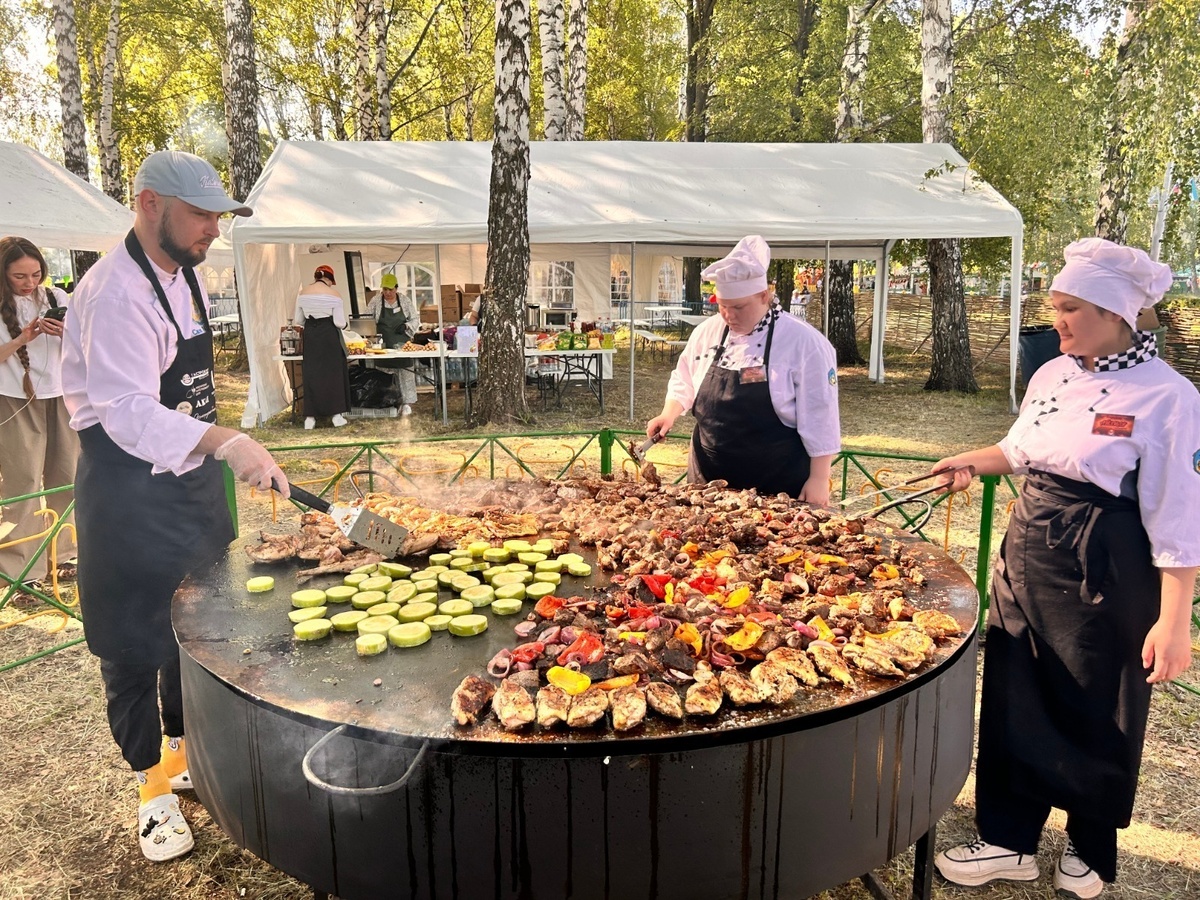 На гриль-сковороде были представлены мясо кролика, два вида индейки, конина, гусь, баранина, говядина, филе утки и множество овощей. Участникам сабантуя блюдо очень понравилось!