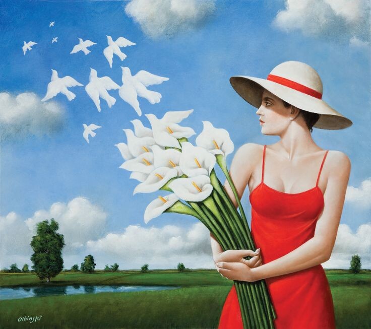Хочу поделиться тем, что люблю. Из ныне живущих художников сюрреалистов мне ближе всего Рафаль Олбински. В моём личном рейтинге он идёт сразу за Дали и Магриттом. Польский художник, живущий в США. Родившийся ещё во времена Второй Мировой. Недавно ему исполнилось 82 года. Признанный мастер сюрреалистической живописи и плакатного искусства. В его картинах соединяются противоположные начала: реальность и фантазия, чувственность и невинность, радость и печаль. Но главное - в них есть неожиданный взгляд на мир, удивляющий и заставляющий задуматься. Его картины не перепутаешь с другими, он мог бы не подписывать их. При первом взгляде понятно - это Олбински! Так увидеть мир может только он. Злые языки называют его подражателем Магритта. Я считаю, что он его талантливый продолжатель. :-)