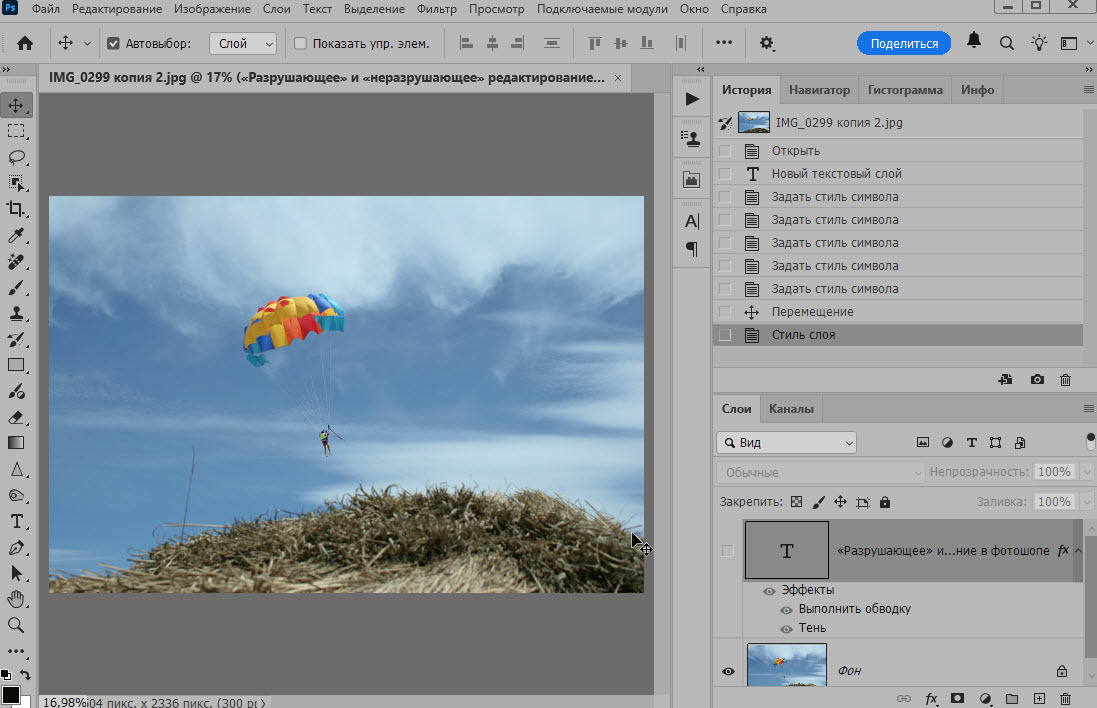 Деструктивная работа подразумевает применение всех ваших изменений к одному слою или набору объединённых слоёв, что не позволяет вам впоследствии вносить правки.