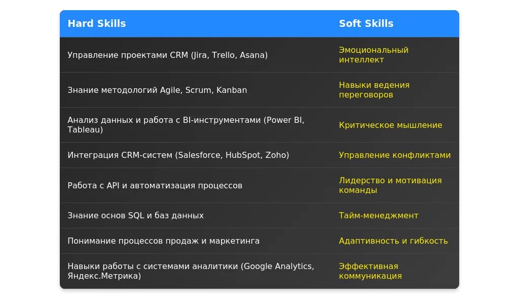 Навыки для акцента: Базовые знания CRM, основы управления проектами, soft skills.