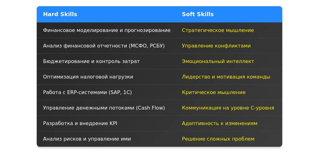 После: "Бюджетирование, финансовый анализ, управление рисками, знание МСФО, опыт работы с ERP-системами".
