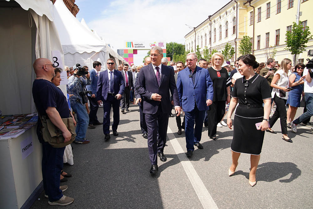 Выставочную площадку мероприятия посетил Глава региона Радий Хабиров 30 мая в столице Башкирии городе Уфе Руководитель республики Радий Хабиров в сопровождении почётных гостей посетил выставочную площадку III Международной книжной ярмарки «Китап-байрам». Об этом сообщают на сайте Главы РБ. Фестиваль, организованный с 30 мая по 1 июня на Советской площади, собрал 270 участников, включая издательства, книжные магазины, частных букинистов, писателей, искусствоведов и общественных деятелей из различных регионов Российской Федерации, а также Республики Беларусь, Республики Казахстан и Исламской Республики Иран. Президент Ассоциации книгоиздателей «АСКИ» Константин Чеченев подчеркнул значимость поддержки, оказываемой руководством республики развитию книгоиздательской деятельности, и отметил, что Башкирское издательство «Китап» занимает лидирующие позиции в стране по количеству и тиражу выпускаемых изданий. Константин Чеченев также отметил масштабность мероприятия и выразил удовлетворение пр