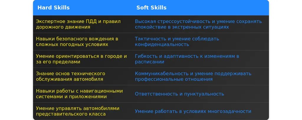 - Ключевые навыки (вождение, знание ПДД, обслуживание авто).