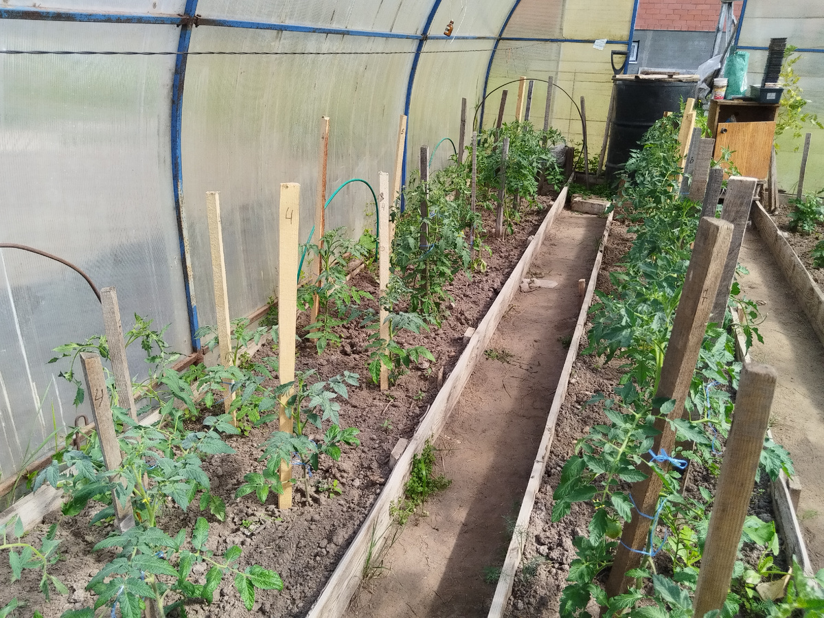 Формирование кустов: Удаляйте пасынки, растущие из пазух листьев. Температура должна быть +22…+25 °C днём и +16…+18 °C ночью. Проветривайте теплицу, открывая форточки и двери. Подвязка кустов: Высокорослые сорта томатов требуют подвязки к надежным опорам. Опоры должны быть на 20–25 см выше кустов. #томаты #огород #сад #помидоры #дача #теплица #томат