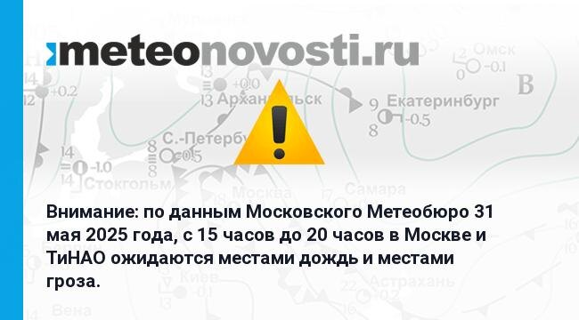 Внимание: по данным Московского Метеобюро 31 мая 2025 года, с 15 часов до 20 часов в Москве и ТиНАО ожидаются местами дождь и местами гроза. Перейти на сайт Прогноз погоды на 14 дней