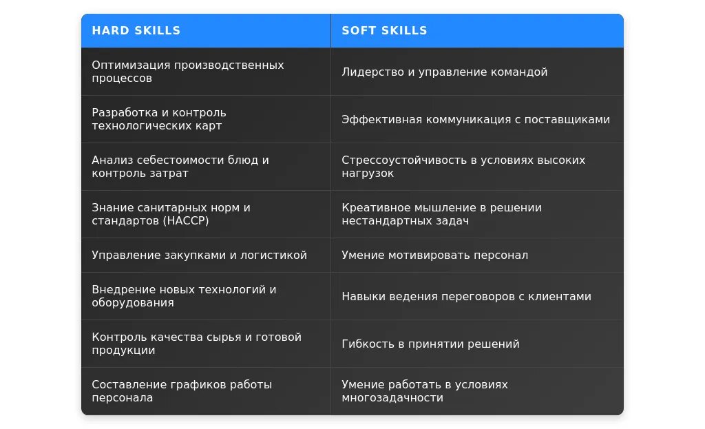До: "Знание кулинарии, работа с персоналом, закупки."