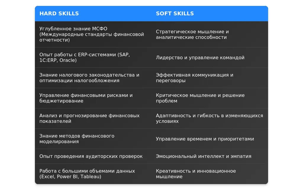 - Навыки, связанные с бухгалтерией и экономикой.