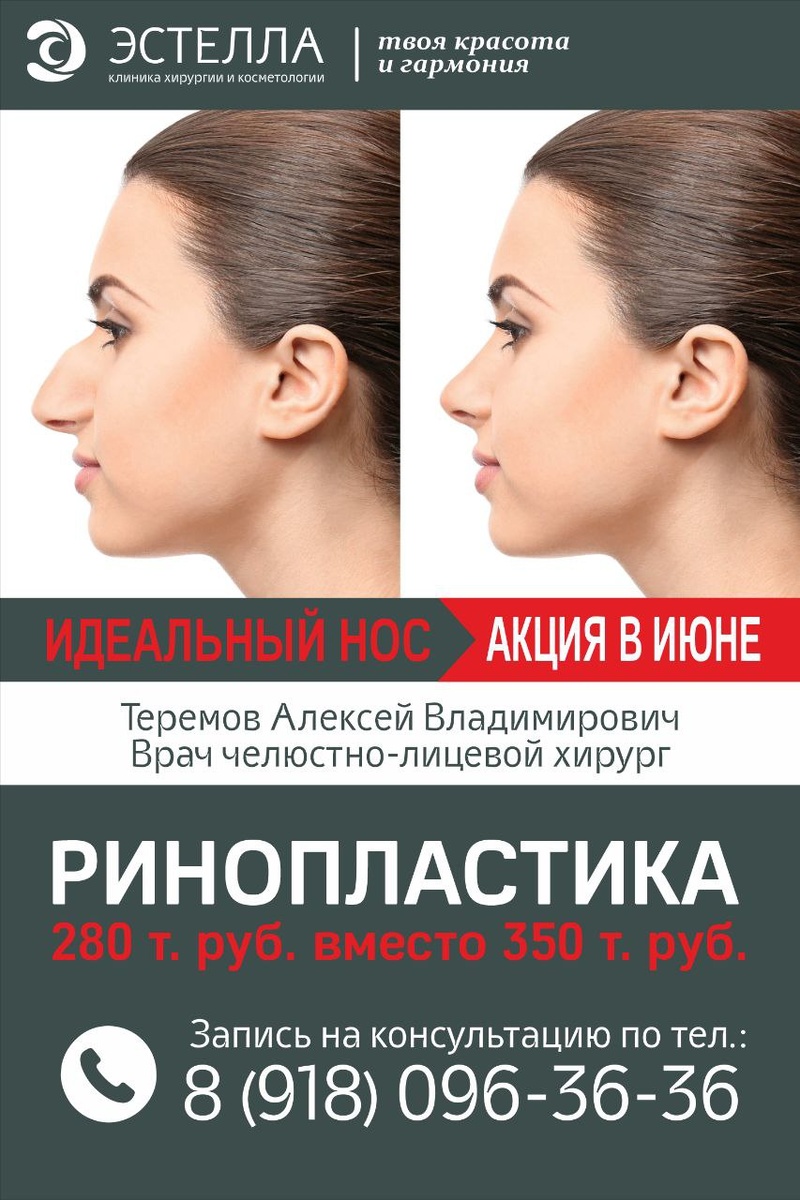 ☀️Акция в июне: "Твой идеальный нос" со скидкой 20% ❗Только в июне! Ринопластика за 280 т.руб. вместо 350 т.руб. ➡️ Выполняет врач челюстно-лицевой хирург Теремов Алексей Владимирович Запись на консультацию 👇🏼 📱 8-918-096-36-36 ☎️ +7 (909) 447 85 07 📍ул. Красных Партизан, 28 (ост.Каляева)