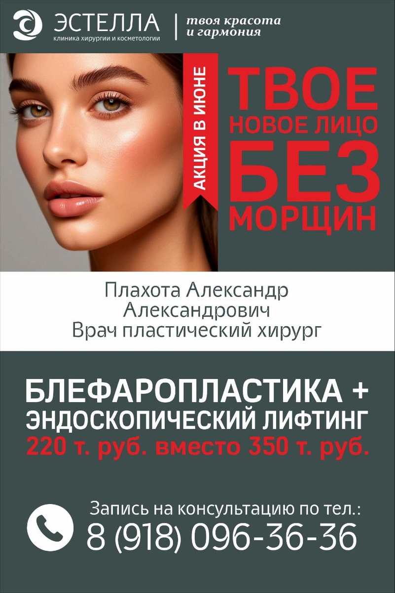 ☀️Акция в июне: "Твоё новое лицо без морщин" со скидкой 38% ❗Только в июне! Блефаропластика + эндоскопический лифтинг за 220 т.руб. вместо 350 т.руб. ➡️ Выполняет врач пластический хирург Плахота Александр Александрович Запись на консультацию 👇🏼 📱 8-918-096-36-36 ☎️ +7 (909) 447 85 07 📍ул. Красных Партизан, 28 (ост.Каляева)