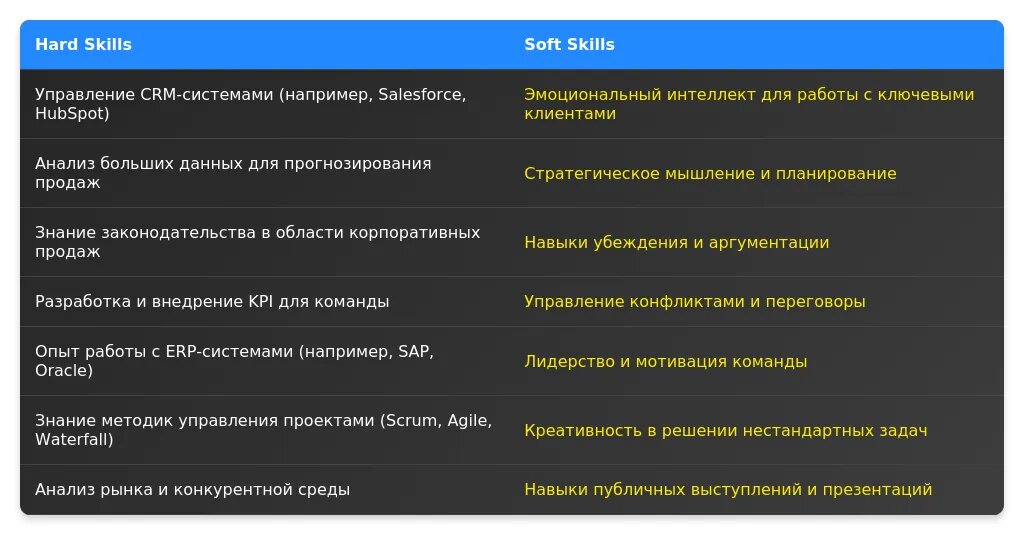После адаптации: "Управление корпоративными клиентами, работа с CRM (Salesforce, Bitrix24), аналитика продаж, навыки переговоров."