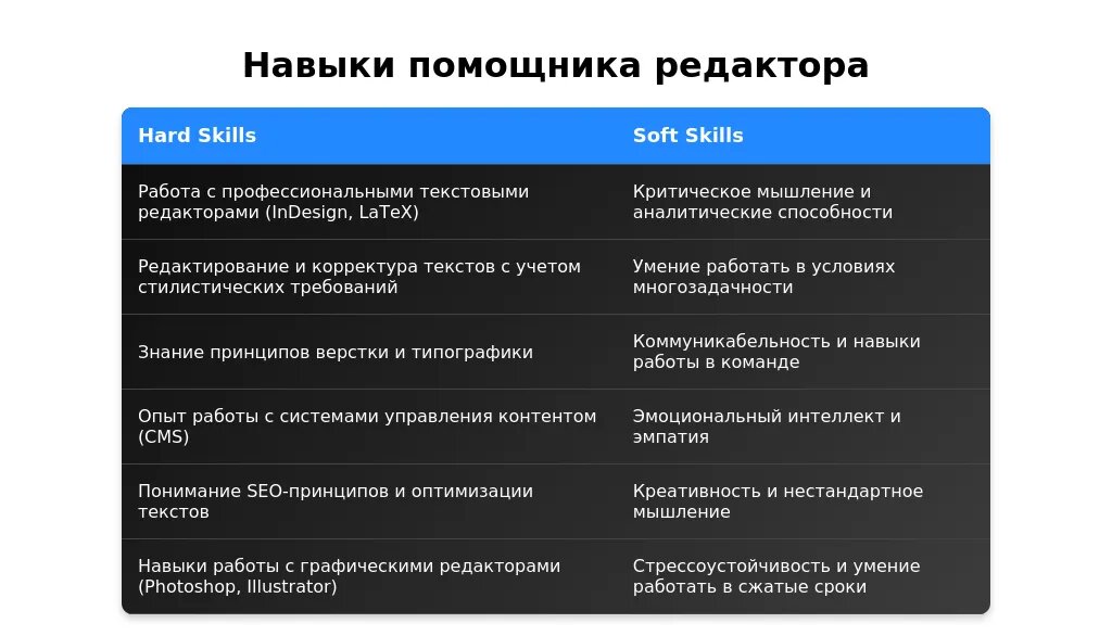 При анализе вакансии для позиции "помощник редактора" в первую очередь важно выделить ключевые требования, которые работодатель считает обязательными. Обратите внимание на такие аспекты, как опыт работы с текстами, знание специфики отрасли, владение инструментами редактирования (например, InDesign, Word, Google Docs) и навыки работы в команде. Желательные требования могут включать знание иностранных языков, опыт работы с графическими редакторами или умение работать в условиях сжатых сроков.