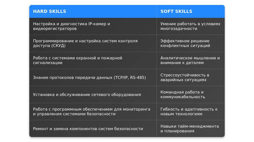 Навыки должны быть перегруппированы под требования вакансии. Например, если вакансия требует знания оборудования Hikvision, это должно быть на первом месте. Используйте ключевые слова из вакансии, такие как "системы видеонаблюдения", "контроль доступа", "пожарная сигнализация".
