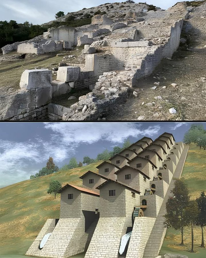 На Юге Франции обнаружены остатки мощной римской мельницы, воссозданной с помощью 3D-реконструкции. Эта передовая мельница, датируемая началом II века н. э., имела 16 водяных колес, расположенных в восемь пар, которые использовали силу воды для помола муки. Она могла производить около 4,5 тонн муки в день — достаточно, чтобы обеспечить 30 000–40 000 человек — демонстрируя впечатляющий масштаб и эффективность римской инженерии. Это место является примером древних промышленных инноваций и наглядно демонстрирует, как римляне удовлетворяли потребности большого городского населения.
