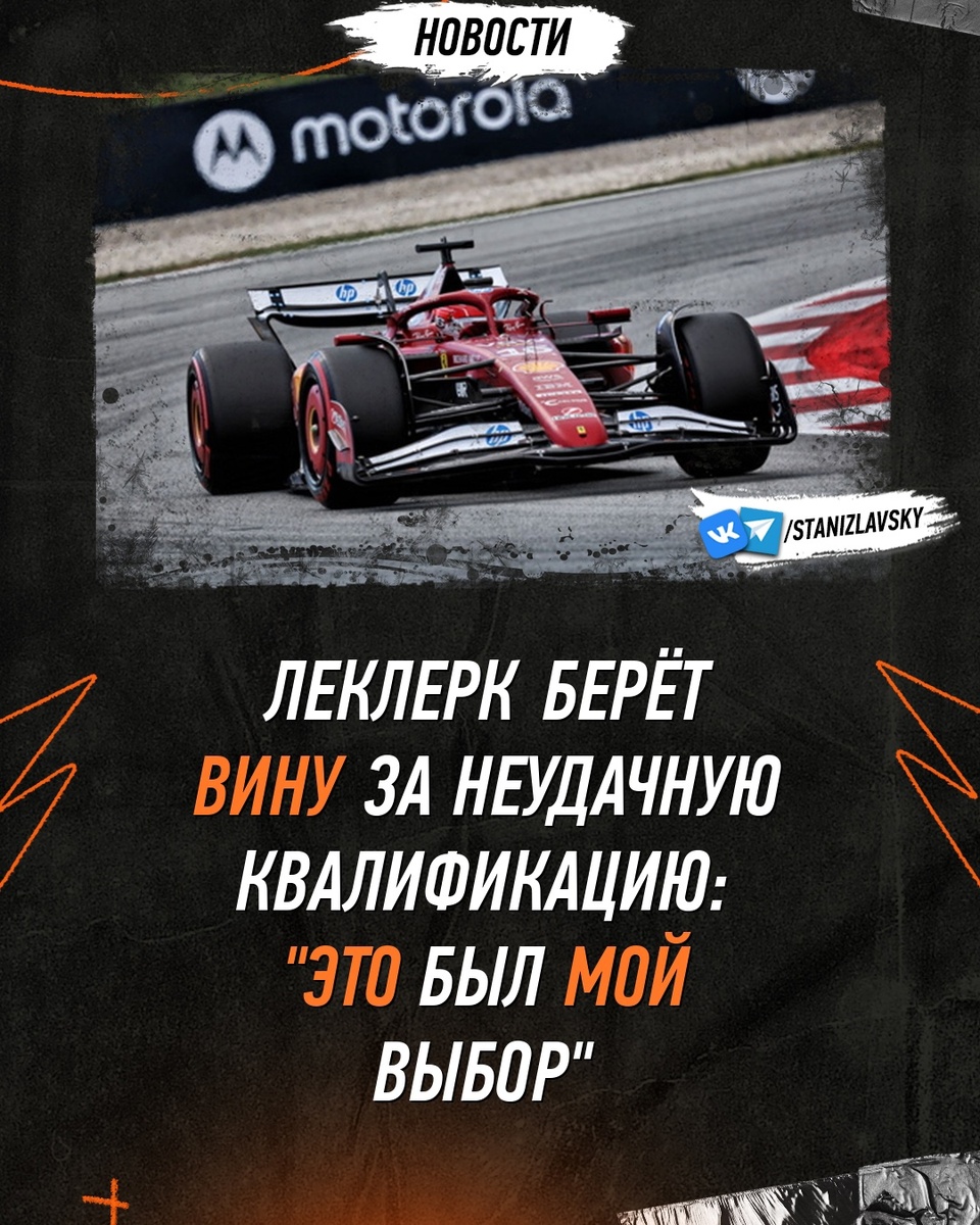 🏎️ Пилот Ferrari Шарль Леклер взял на себя полную ответственность за неудачную квалификацию на Гран-при Испании. 📊 Тактика с одной попыткой в Q3 не сработала: Леклер стартует седьмым, отставая более чем на полсекунды от Оскара Пиастри. Его результат также уступил результату напарника Льюиса Хэмилтона, который квалифицировался пятым. 💬 «Я думаю, что с двумя попытками в Q3 было бы проще — возможно, я бы нашёл ещё немного времени. Не знаю, сколько именно. Также, может быть, немного изменилась погода, но я беру всю ответственность на себя. Это я решил выезжать в середине сегмента, хотя команда предлагала подождать до конца. Я боялся что в финале кто-то может допустить ошибку и я не успею показать время вовсе. Это мой выбор, и я за него отвечаю. Я также хотел оставить лучшие шины для гонки. Если завтра всё пойдёт плохо, я возьму ответственность за весь уик-энд. Если всё получится, то я, конечно, буду рад, что выбрал правильную стратегию. Всё покажет время. Седьмое место — ниже наших ожид
