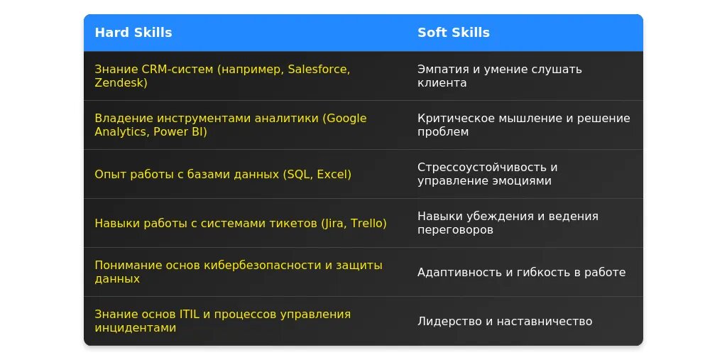 На что делать акцент: коммуникативные навыки, стрессоустойчивость, умение работать в команде, базовые знания CRM-систем.