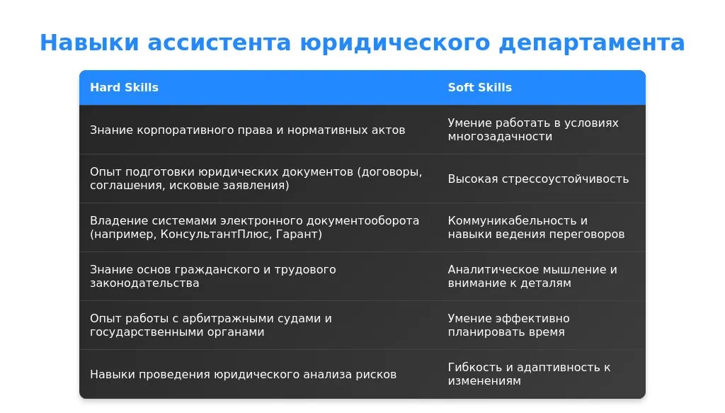 При анализе вакансии для профессии "ассистент юридического департамента" важно выделить ключевые требования, которые работодатель считает обязательными. Это могут быть навыки работы с юридической документацией, знание законодательства, опыт использования CRM-систем или умение вести переговоры. Обратите внимание на формулировки: если требования указаны как "обязательно" или "необходимо", это сигнализирует о важности таких навыков. Желательные требования, такие как знание иностранного языка или опыт работы в конкретной отрасли, также важны, но могут быть компенсированы другими сильными сторонами кандидата.