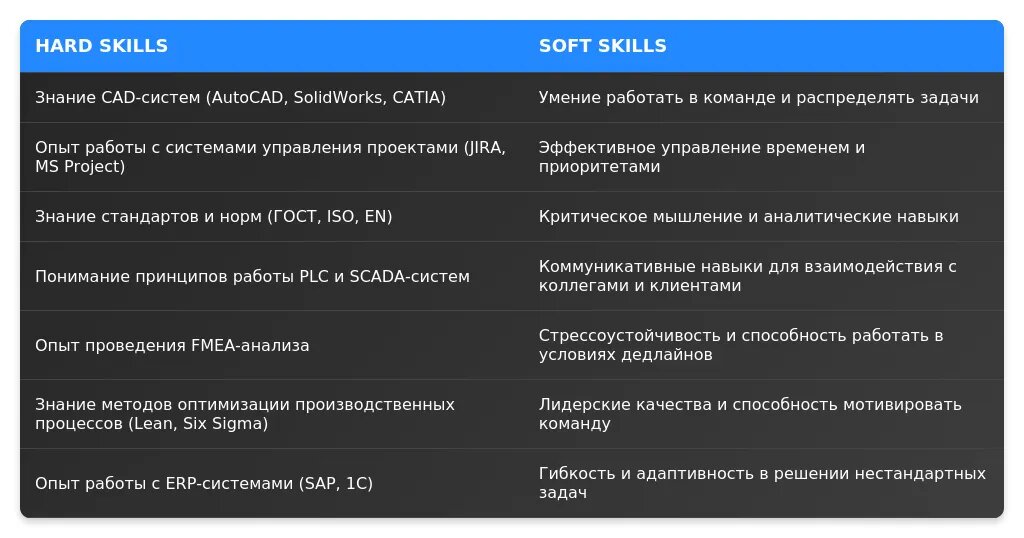 После адаптации: "SolidWorks, AutoCAD, управление проектами, разработка технической документации, знание ГОСТ и ISO."