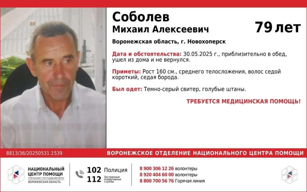 Жителей Воронежской области просят помочь в поисках 79-летнего Михаила Соболева. Ориентировку на мужчину опубликовали в Telegram-канале «Национальный центр помощи детям Воронежское отделение» в субботу, 31 мая. По информации добровольцев, мужчина пропал в Новохоперске. Вчера около 12.00 он ушел из дома и не вернулся. С тех пор о его местонахождении информации нет. Местному жителю требуется медицинская помощь. Его приметы: рост 160 см, среднее телосложение, седые короткие волосы и седая борода. В день исчезновения был одет в темно-серый свитер и голубые штаны. Всех, кто обладает какой-либо информацией о Михаиле Соболеве или видел похожего по приметам человека, просят позвонить по телефонам 112 (служба спасения), 102 (полиция) или 8-900-306-12-26 (добровольцы).