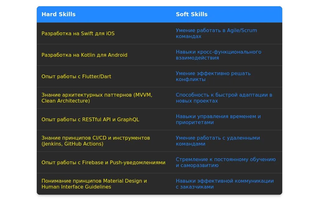Ключевые слова для заголовка: мобильный разработчик, iOS, Android, Flutter, React Native, Kotlin, Swift, Junior/Middle/Senior.