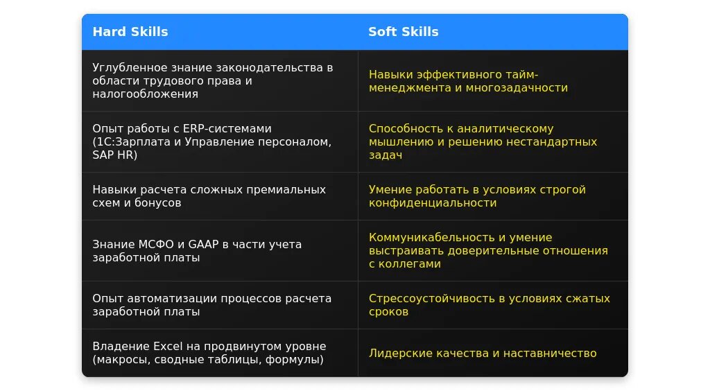 При анализе вакансии важно выделить ключевые требования, которые работодатель считает обязательными. В первую очередь обратите внимание на профессиональные навыки, такие как знание программного обеспечения для расчета зарплаты (1С:Зарплата и управление персоналом, SAP, Excel), опыт работы с налоговыми отчетностями и знание трудового законодательства. Также важно учитывать уровень ответственности, например, работа с большим объемом данных или руководство командой. Желательные требования могут включать дополнительные компетенции, такие как знание английского языка или опыт работы в международных компаниях.