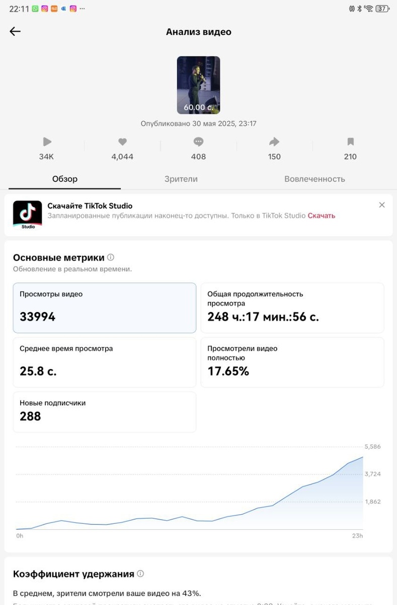 Добрый вечер всем. Сказать, что я охреневаю - это все-равно ничего не сказать... Есть у меня канал в Тик-Ток. Давно уже. Мертвый практически. Видео выкладывают я редко. 30 просмотров, 150... Последние песни - около 300. Все объяснимо. Вчера было 28 подписчиков. Можете судить о популярности канала... Выложил песню "Ушли вдвоём" из альбома "Юра. Реквием"... И вот результат... Походу не тем я занимаюсь, не тем...