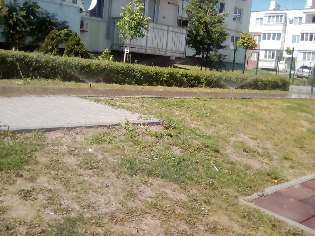 В нашем дворе включили фонтаны, чтобы поливать деревья, цветы и траву!