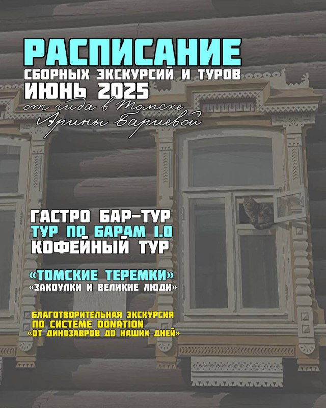 Каждая экскурсия и тур могут быть проведены в индивидуальном формате и есть подарочные сертификаты на сумму/тур. Сайт с моими экскурсиями: https://guidetomsk.ru/ *** 7.06 СБ 12:00 "ТОМСКИЕ ТЕРЕМКИ"