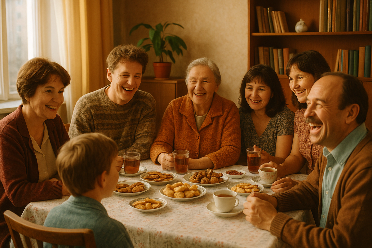 Помните, как это было? Не нужно было повода, даты, заранее согласованного времени. Просто вдруг открывалась дверь — и появлялись «Марьиванна с четвёртого» или тётя Лида из другого конца города. И первое, что слышали в ответ на извиняющееся: «Ой, мы ненадолго…» — это бодрое: «Проходите, садитесь. Сейчас чай поставим.» Стол был простым, но щедрым. Варенье, сахар в сахарнице, лимон, если завалялся, хлеб и что найдётся в холодильнике — этого было достаточно, чтобы развернуть настоящее гостеприимство. Помните, как расправлялась та самая скатерть с пятнышком от компота? Или как доставалась посуда «на случай гостей» — сервиз, у которого одна чашка с отколотым краем, но её всегда оставляли для себя, не для гостей. Как мы помещались — загадка. Особенно зимой, когда все в пальто, валенках, с детьми. Но никому и в голову не приходило жаловаться на тесноту. Диван — для старших, кресло — для тех, кто пришёл пораньше, табуретка — для самого разговорчивого. А на полу, на подушке, спокойно мог распол