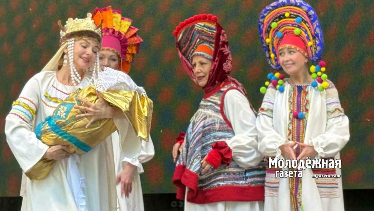 Костюмы постановки выдержаны в светлой гамме. Белый — символ чистоты, невинности, открытости, высшей духовности, добра. Он вдохновляет и внушает надежду, а еще изначально гасит визуальный шум. Белые рубахи и сарафаны украшены изысканной красной и охристой отделкой, в оторочке сарафанов, кокошника Ткачихи есть намек на лоскутное буйство палитры печворка, но главенствует в общем решении белоснежный цвет. Его органично дополняют отдельные роскошные детали. Например, сверкающие самоцветами и золотом короны, бармы, сапоги. Театральная метка несказанных богатств и сокровищ сюжета. Такое художественное оформление во главу угла ставит яркий и образный пушкинский текст.