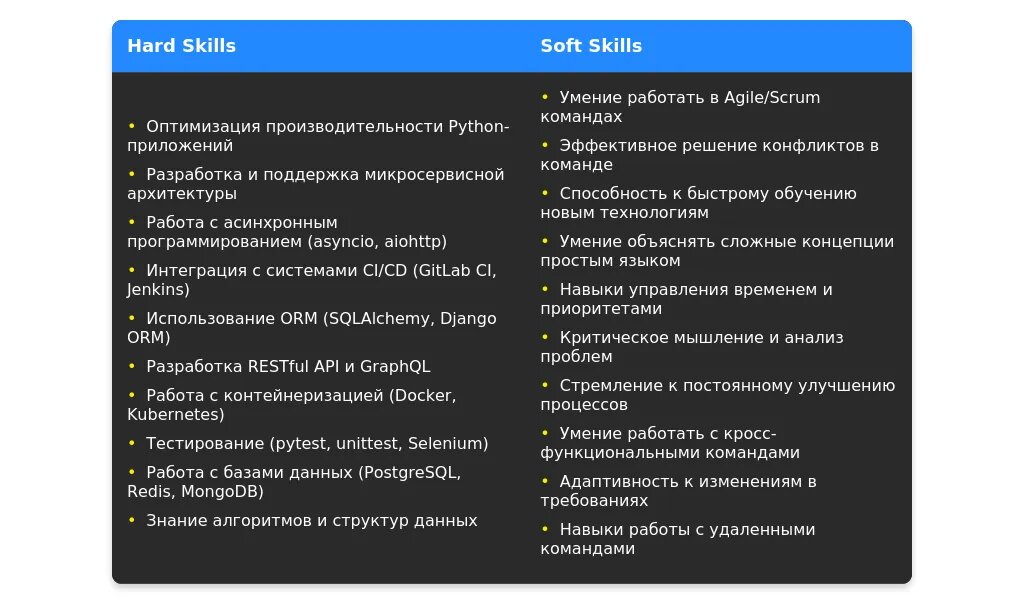 - Ключевые навыки и технологии (Python, Django, Flask и т.д.).