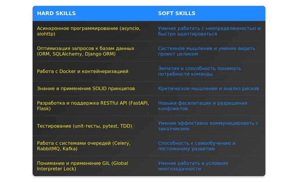 - Ключевые навыки (Python, фреймворки, базы данных).