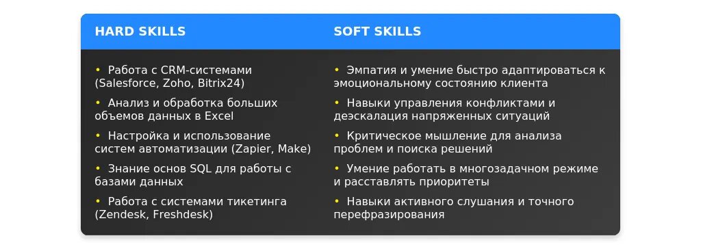 После адаптации: "Работа с CRM-системами (Salesforce, Bitrix24), знание английского языка на уровне Intermediate, навыки обработки до 100 обращений в день." Конкретные навыки.