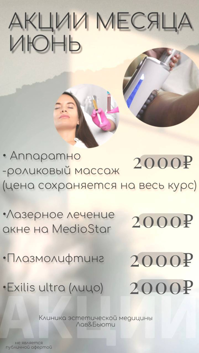 Акции июля! 1. Роликовый массаж - это инновационная методика, направленная на скульптурирование фигуры и устранение целлюлита Эффект от массажа: • Улучшение качества кожи и устранение признаков целлюлита на всех стадиях • Уменьшение объёмов до 2-х размеров • Выравнивание рельефа кожи, возвращение ей тонуса и эластичности • Уменьшение боли в мышцах после физических нагрузок • Эффект заметен уже после первой процедуры. Для достижения лучшего результата мы рекомендуем пройти курс из 10 процедур, чередуя через 2-3 дня. 2. Лазерное лечение акне на аппарате MeDioStar NeXT PRO — это современная процедура, применяемая для борьбы с воспалительными и поствоспалительными проявлениями акне. Аппарат MeDioStar NeXT PRO — это высокоэнергетический диодный лазер Преимущества процедуры: • Безопасность и минимальная травматизация кожи • Подходит для жирной, воспалённой кожи • Может применяться при активных высыпаниях • Сокращение количества воспалений и улучшение общего состояния кожи ⸻ Ск
