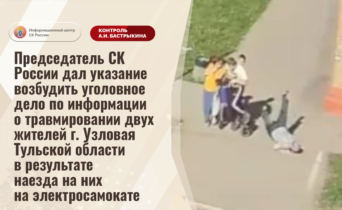 Председатель СК России дал указание возбудить уголовное дело по информации о травмировании двух жителей г. Узловая Тульской области в результате наезда на них на электросамокате В СМИ сообщается, что в мае текущего года в городе Узловая Тульской области два подростка, передвигаясь на одном средстве индивидуальной мобильности, сбили женщину и пожилого мужчину в пешеходной зоне. При этом водитель электросамоката с места происшествия скрылся. В СУ СК России по Тульской области по данному факту организована процессуальная проверка. Председатель Следственного комитета Российской Федерации Александр Иванович Бастрыкин дал указание руководителю СУ СК России по Тульской области Владимиру Владимировичу Усову возбудить уголовное дело и представить доклад о ходе и результатах его расследования. Исполнение поручения поставлено на контроль в центральном аппарате ведомства. #СледственныйКомитет #СКРоссии #СКР #ИЦСКР #Информационныйцентр #АлександрБастрыкин #ПредседательСКР #КонтрольПредседателяСКР