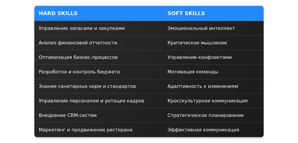 Обязательная информация: ключевые навыки, профессиональные достижения, личные качества, которые помогут в управлении рестораном.