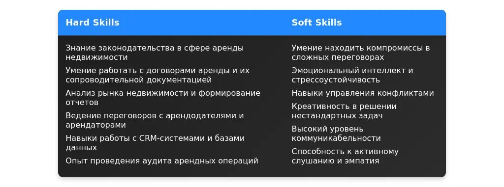После адаптации: "Навыки ведения переговоров, знание законодательства в сфере аренды, опыт работы с CRM-системами, умение работать с большим объемом данных."