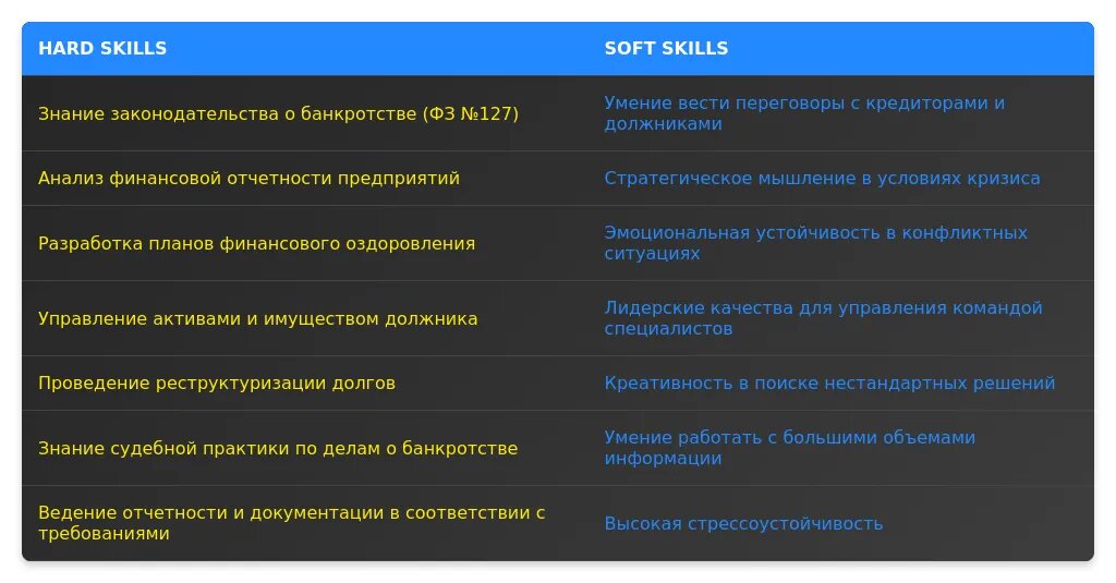 После: Углубленное знание арбитражного законодательства, управление процедурами банкротства, взаимодействие с государственными органами.