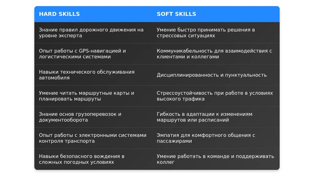 - Баланс навыков: "Управление автомобилем, планирование маршрутов, техническое обслуживание, работа с клиентами".