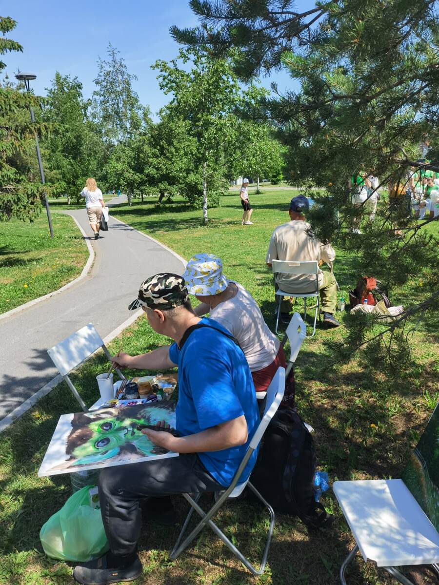 Действительно прекрасный день. В десять утра в парке на озере Кашкадан состоялась творческая встреча художников, мы писали работы для балаготворительного аукциона, в котором принимали участие все члены союза художников Юнеско РБ, а также приглашенные на плэнер свободные художники. Я встала в восемь утра, поела яишенку из трех яиц, намазалась кремом с SPF50 и отправилась на встречу художников, к какой-то таинственной площадке в парке, которая называлась "Зеленая Башкирия". Я искала эту площадку ровно сорок минут, когда нашла, очень обрадовалась. Художников было не так много, может человек двадцать, я думала, что плэнер будет более оживленный. Еще день выдался на редкость теплый, можно сказать, была жара, как на юге. Только я сетовала, что в Башкирии холодное лето, и тут раз, и внезапно столбик термометра подскочил до тридцати градусов. У меня сгорели плечи и немного сгорели руки, на солнце, пока мы писали наши картины. Написанные картины мы оставили в союзе художников. Когда они в
