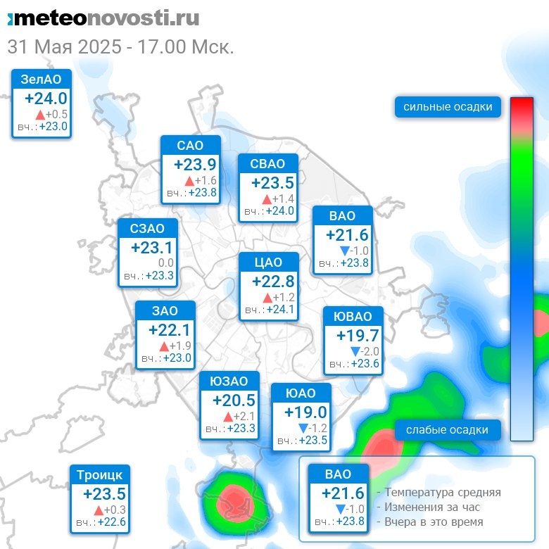 В 17:00 в Москве было от +18.8°C до +27°C, средняя температура +22.5°C #погода #Москва #весна #температура #31мая #суббота