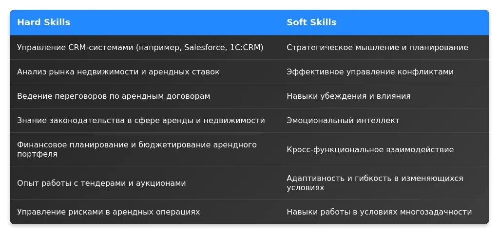 После адаптации: "Опыт работы с CRM-системами (Salesforce, Bitrix24), управление командой, ведение переговоров, знание арендного законодательства."