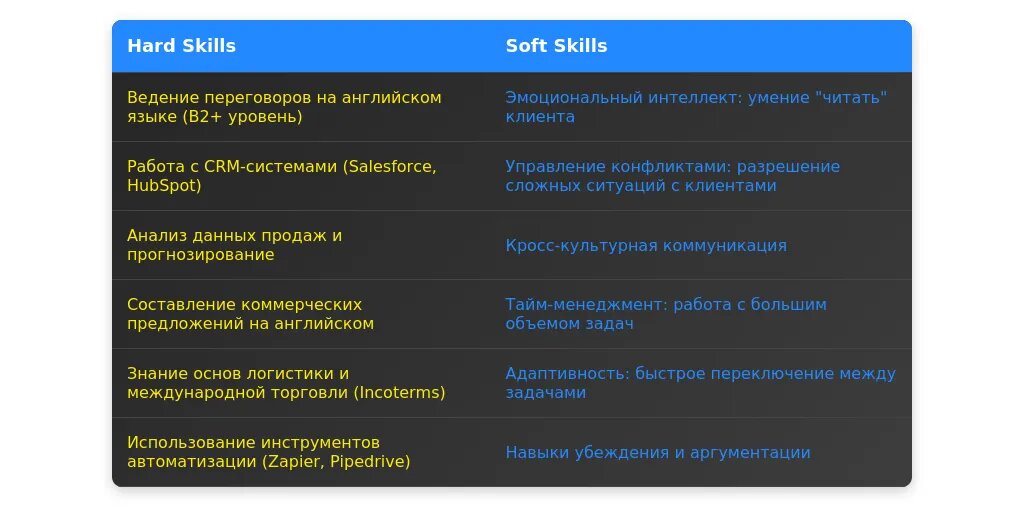 Ключевые навыки (например, переговоры, работа с клиентами, знание английского).