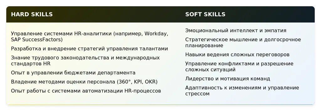 После адаптации: "Стратегическое управление персоналом, внедрение HR-систем, знание трудового законодательства, управление изменениями."