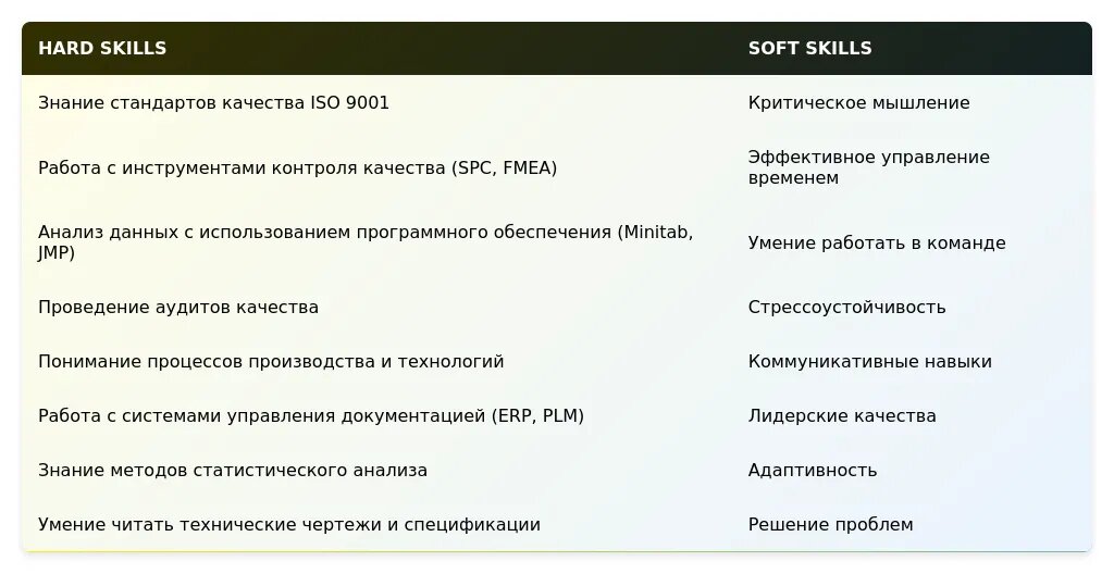 После адаптации: "Знание стандартов ISO 9001, опыт работы с ERP-системами, контроль качества продукции, анализ данных."