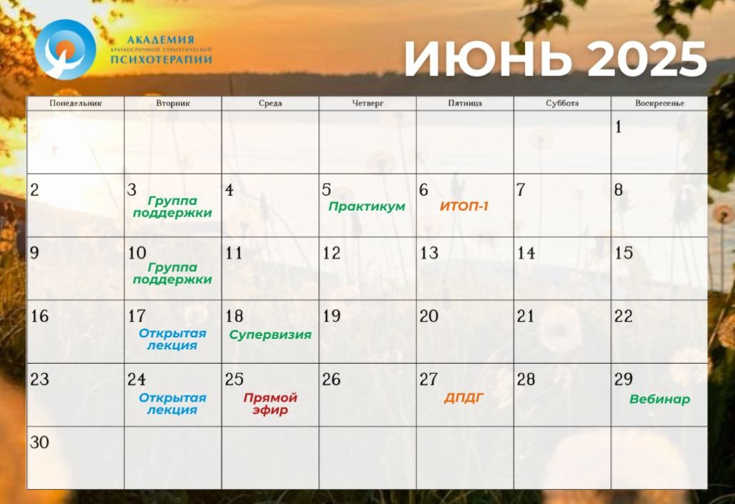 🕊️ Завтра уже лето! Давайте проведем его вместе - выбирайте мероприятия по душе. И до встречи в Академии! 🔴 ОБУЧЕНИЕ • 6, 7, 8 июня ✨ Телесно-ориентированная психотерапия (1 модуль, релаксационно-диагностический комплекс) 👥 Проводит: Сергей Иванович Масловский 🔗 Можно присоединиться [здесь] • 27, 28, 29 июня ✨ Десенсибилизация и переработка движениями глаз (ДПДГ или EMDR) 👥 Проводит: Сергей Иванович Масловский 🔗 Можно присоединиться [здесь] 🟢 ПРАКТИКУМЫ, ГРУППЫ и ВЕБИНАРЫ • 3 июня, 12:00-15:00 ✨ группа поддержки «ВСПОМНИТЬ ВСЕ про МАК» 👥 Проводит: Елена Кахраманова 🔗 Можно присоединиться [здесь] • 5 июня ✨ телесно-голосовой практикум "ЭМОЦИИ. Как не перегреться этим летом?" 👥 Проводит: Ольга Крылова 🔗 На практикум необходимо [зарегистрироваться] • 10 июня, 17:00-20:00 ✨ группа поддержки «ВСПОМНИТЬ ВСЕ про ИТОП» 👥 Проводит: Елена Кахраманова 🔗 Можно присоединиться [здесь] • 19 июня ✨ телесно-голосовой практикум "ЭМОЦИИ. Как не перегреться этим летом?" 👥 Проводит: Оль