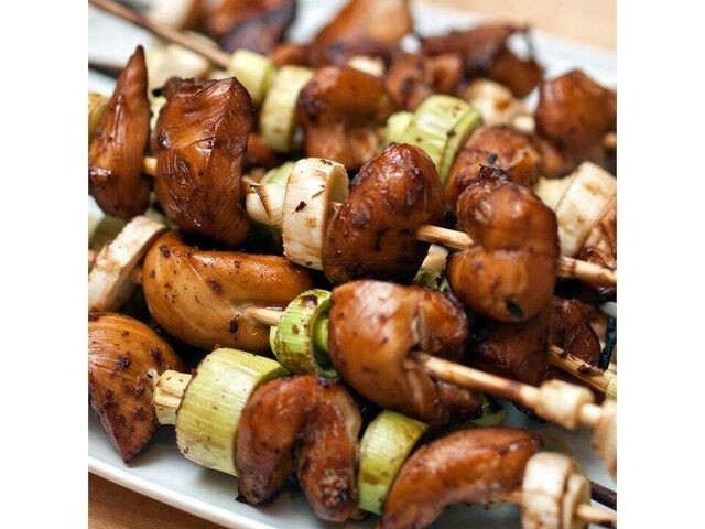 Цыпленок якитори Курица маринуется в соусе из соевого соуса, саке и имбиря, затем нанизывается на шампуры и обжаривается с луком-пореем - простое, вкусное и веселое блюдо. ⌛ Подготовка: 25 мин. ⏰ Приготовление: 45 мин. 🍴 Количество: 6 шампуров Ингредиенты ✅ ½ чашки саке ✅ ½ чашки соевого соуса ✅ 1 столовая ложка сахара ✅ 1 зубчик чеснока, раздавленный ✅ 1 (5.00 см) кусочек свежего корня имбиря, натертый ✅ ¼ кг куриной грудки без кожи и костей - кубиками ✅ 3 лука-порея, только белая часть, нарезанная на кусочки размером 1/5.00 см. Инструкция приготовления 1. В средней посуде смешайте саке, соевый соус, сахар, чеснок и имбирь. Добавьте курицу и оставьте мариноваться на 15 минут. 2. Разогрейте бройлер в духовке. Смажьте шесть металлических шампуров и нанизывайте на них поочередно 3 куска курицы и 2 куска лука-порея. Выложить на лист для выпечки или противень и смазать маринадом. 3. Запекать около 5 минут, снова смазать маринадом, затем запекать еще 5 минут, или пока курица не пр